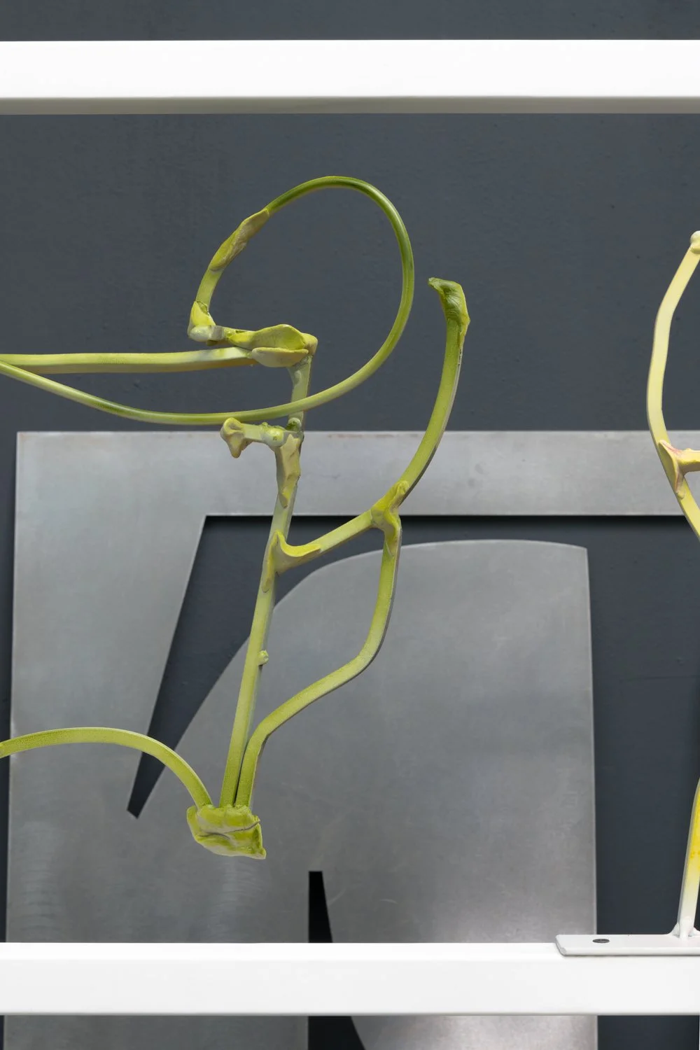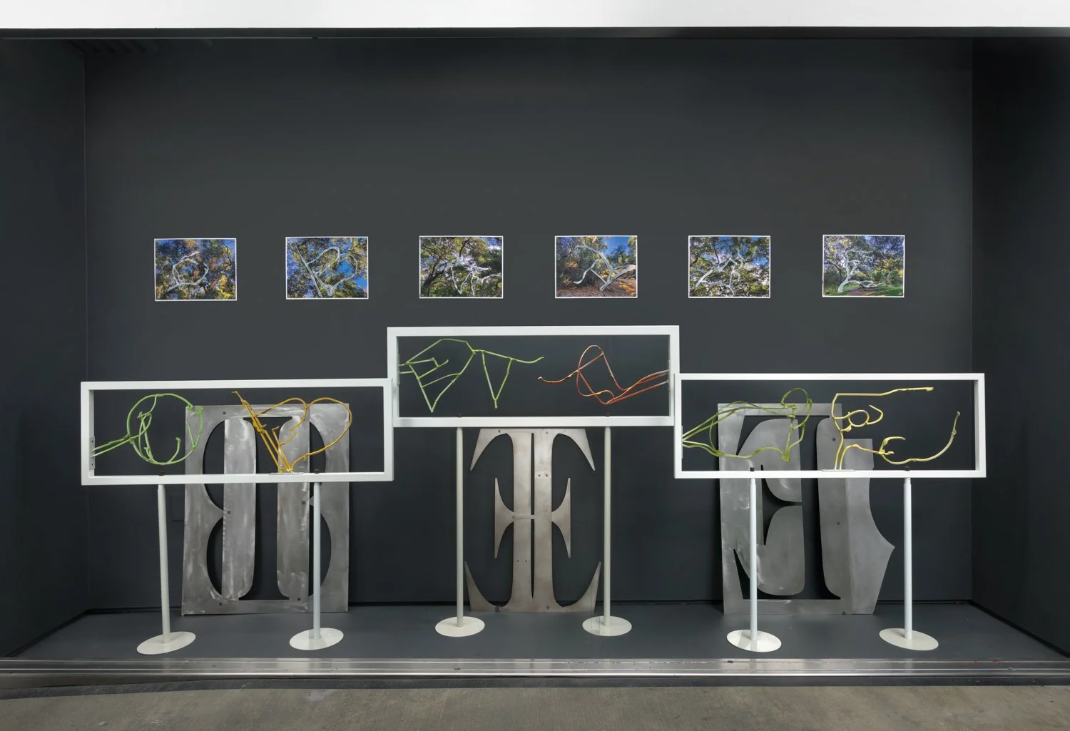The work is derived from the characteristic marks used in cursive writing and accompanied by images of an oak branch sourced from photographs of tree boughs taken over time at Descanso Gardens. The work is dedicated by O’Brien to Steve and Sari Roden for the many years of performance work created in collaboration with the artist Toti O’Brien, often based on letterforms.